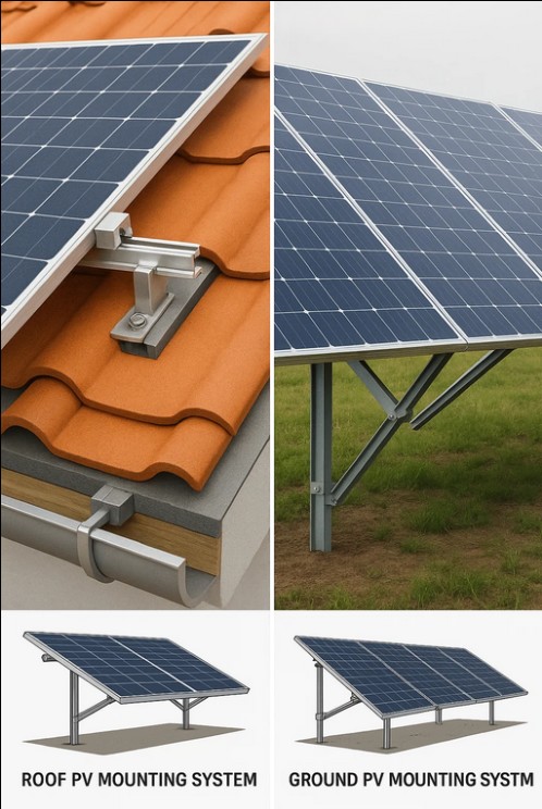 ছাদের পিভি মাউন্টিং সিস্টেম সরাসরি আবাসিক, বাণিজ্যিক বা শিল্প ভবনের ছাদে ইনস্টল করা হয়। তারা সৌর প্যানেল সমর্থন করার জন্য বিদ্যমান বিল্ডিং কাঠামো ব্যবহার করে। ইনস্টলেশন ছাদের প্রকারের উপর নির্ভর করে পরিবর্তিত হতে পারে, যেমন সমতল ছাদ বা ঢালু ছাদ, এবং প্রায়শই বিল্ডিংয়ের সাথে নিরাপদ একীকরণ নিশ্চিত করতে কাস্টমাইজড মাউন্টিং বন্ধনীর প্রয়োজন হয়। বিপরীতে, গ্রাউন্ড পিভি মাউন্টিং সিস্টেম খোলা জমিতে স্থাপন করা হয়। তাদের সমর্থনকারী কাঠামোগুলি সাধারণত সামঞ্জস্যযোগ্য, যা বিকাশকারীদের সর্বাধিক সৌর শক্তি ক্যাপচারের জন্য প্যানেল অভিযোজন এবং কাত কোণ অপ্টিমাইজ করতে দেয়। ছাদের ইনস্টলেশনের সাথে তুলনা করে, গ্রাউন্ড-মাউন্ট করা সিস্টেমে সাধারণত স্থান এবং নকশার নমনীয়তার ক্ষেত্রে কম সীমাবদ্ধতা থাকে, তবে তাদের পূর্বশর্ত হিসাবে জমির প্রাপ্যতা প্রয়োজন।