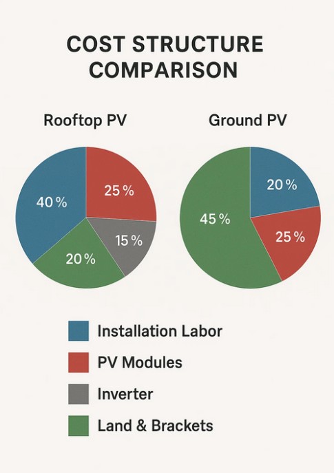 এই দুটি সিস্টেমের তুলনা করার সময় খরচ একটি গুরুত্বপূর্ণ ফ্যাক্টর। ছাদের পিভি সিস্টেমে সাধারণত জমি ব্যবহারের জন্য কম খরচ হয় কারণ তারা বিদ্যমান বিল্ডিং কাঠামো ব্যবহার করে। যাইহোক, যদি ছাদের অনিয়মিত আকার থাকে বা শক্তিবৃদ্ধির প্রয়োজন হয় তবে ইনস্টলেশন জটিলতা খরচ বাড়াতে পারে। গ্রাউন্ড পিভি সিস্টেমে সাধারণত জমি তৈরি, ভিত্তি নির্মাণ এবং সহায়ক কাঠামোর কারণে প্রাথমিক খরচ বেশি থাকে। তবুও, গ্রাউন্ড সিস্টেমগুলি প্রায়শই স্কেল অর্থনীতির জন্য অনুমতি দেয়, যা তাদের বড় প্রকল্পগুলির জন্য সাশ্রয়ী করে তোলে। সামগ্রিক বিনিয়োগের সিদ্ধান্ত নির্ভর করে উপলব্ধ ভূমি সম্পদ, প্রত্যাশিত শক্তি উৎপাদন, এবং বিনিয়োগে দীর্ঘমেয়াদী রিটার্নের উপর।